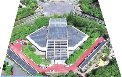 国网天津综合能源公司工作人员对天津市首个实用化、规模化的零能耗建筑──中新天津生态城不动产登记服务中心航拍。