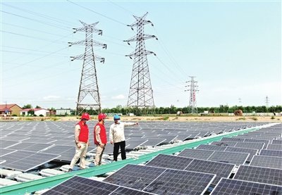 国网天津城南公司工作人员在荣程钢铁集团40兆瓦蓄水池分布式光伏项目现场协助用户进行光伏并网工作。