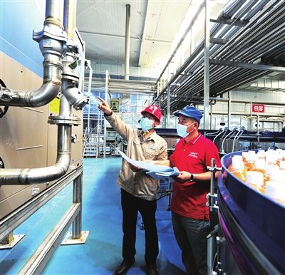 国网(天津)综合能源服务有限公司员工在天津冠芳果汁有限公司自动化生产线旁了解饮料生产设备用电情况。