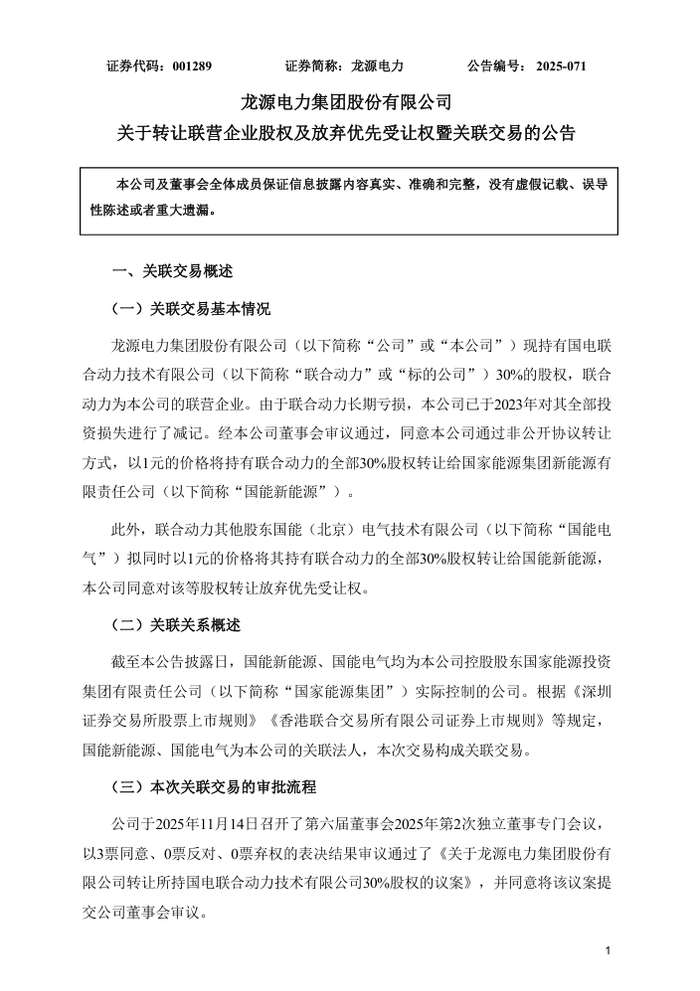 风芒能源获悉,11月14日,龙源电力发布《关于转让联营企业股权及放弃优先受让权暨关联交易的公告》。