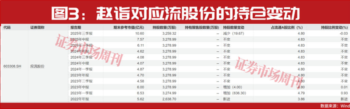 再比如应流股份,最新前十大股东中则有曾以“四冠王”著称的,现泉果基金基金经理赵诣的身影,且赵诣对应流股份的持仓也并非一朝一夕,自2022年四季度末以来,已连续12个季度对其重仓持有,但随着年内股价的大涨(见图2),赵诣在今年三季度期间对所持公司股份进行了小规模的减持(见图3)。