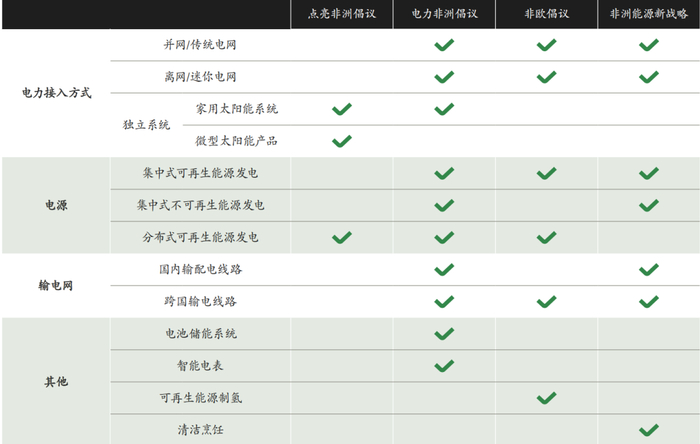 这些国际倡议支持较为广泛的能源与电力技术类型。总体来看,并网和离网方案双管齐下,并优先可再生能源发电是国际倡议所覆盖技术类型的共同特征。具体来看,“电力非洲倡议”、“非欧倡议”和“非洲能源新战略”均同时支持并网和离网项目,涵盖集中式、分布式发电站及输配电线路等,惠及城市和乡村人口,改善商业和居民用电;“点亮非洲倡议”则仅聚焦离网方案,包括家用太阳能系统和微型太阳能产品,更大程度上惠及偏远地区人口。同时,这四个倡议均优先采用可再生能源发电模式,推动非洲地区的清洁能源转型。