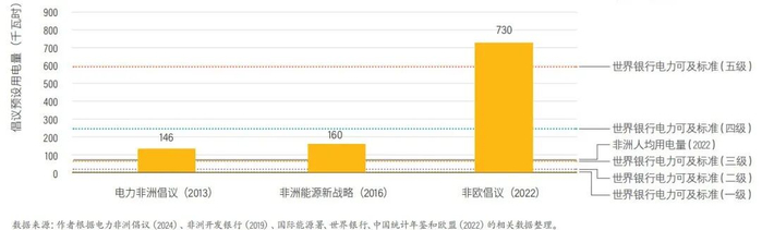 根据各自设定的量化目标,“电力非洲倡议”、“非洲能源新战略”和“非欧倡议”预设的人均用电量目标分别高于世界银行电力可及第三级和第四级标准,其中“非欧倡议”预设的人均用电量已远高于第五级电力可及标准。