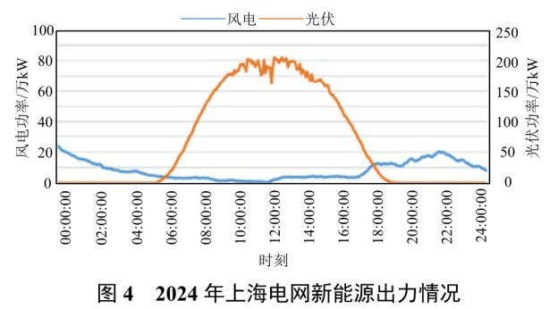 2)新能源受端电网能源供给安全面临风险。截至2024年7月,上海本地新能源装机容量约454万kW,其中,光伏占比超过76%。年度累计新增装机约57万kW,均为分布式光伏。据统计,7月28日12:17风机光伏出力创历史新高,首次突破300万kW大关,达到312万kW,较2023年迎峰度夏期间最大出力增长39.8%。在新能源保供支撑能力方面,光伏午峰出力同时率大于40%,对午峰时段的保供发挥了较好的支撑作用,但晚峰光伏无出力;风电高峰期间的同时率不到15%,支撑能力不足,8月2日11:11上海电网最高负荷时刻风电出力仅0.9万kW,当日06:00—17:00风电出力均低于6万kW,“极热无风”特征明显,具体新能源出力如图4所示。