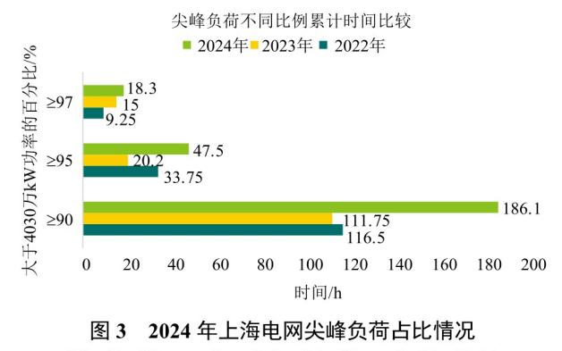 1)新型电力负荷不断改变电力需求曲线。2024年上海电网尖峰负荷占比情况见图3。可以看出,2024年夏季大于97%(3909万kW)最高用电负荷天数共5天,累计18h;大于95%(3829万kW)最高用电负荷天数共10天,累计47h;大于90%(3627万kW)最高用电负荷天数共29天,累计186h。受尖峰电价政策影响,2024年夏季上海高温日最高负荷日趋平稳,尖峰负荷小时数明显拉长。
